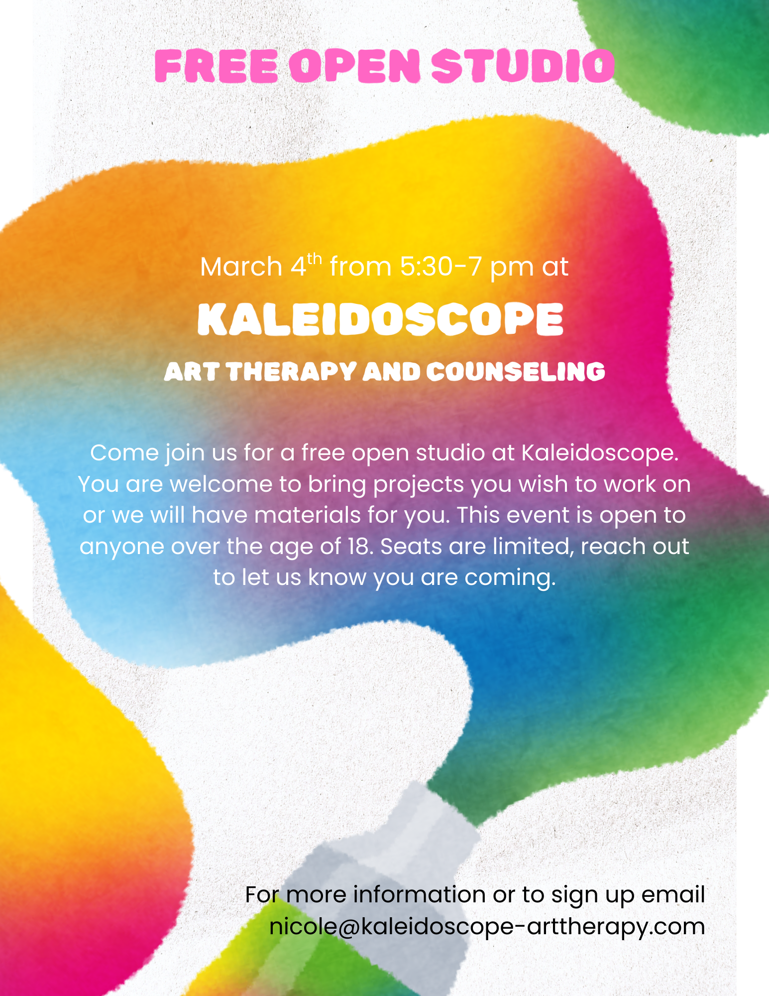 Come join us for a free open studio at Kaleidoscope. You are welcome to bring projects you wish to work on or we will have materials for you. This event is open to anyone over the age of 18. Seats are limited, reach out to let us know you are coming.
